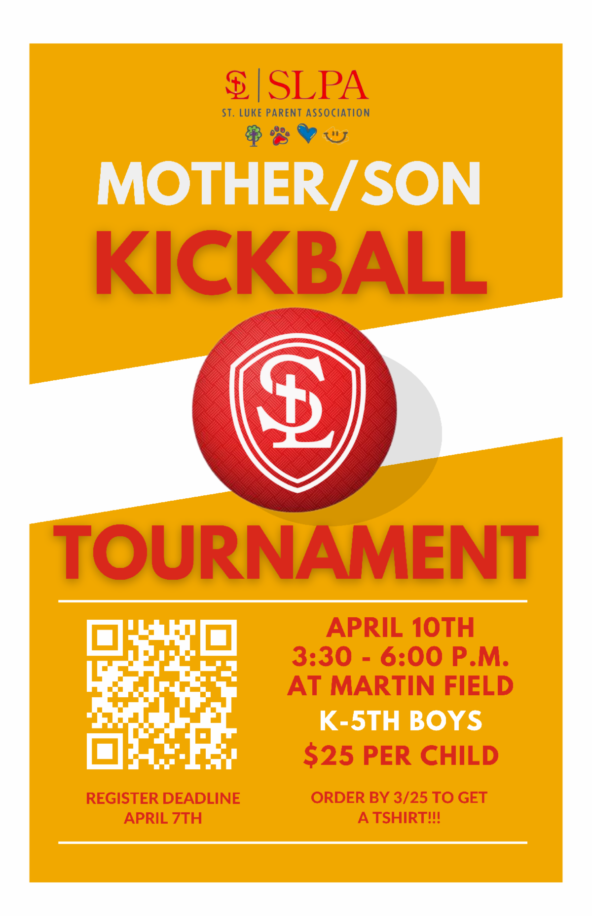 3:30- Mother-Son Kickball Tournament- Please see the SLPA section for more details.